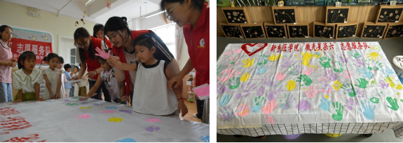 活动结束后,小朋友和志愿者们共同协作在旗帜上用颜料印上了自己的手印,记录着他们共同参与的美好时光。这一幕幕温馨的画面,展现了志愿者们的团队精神和对孩子们的关爱。