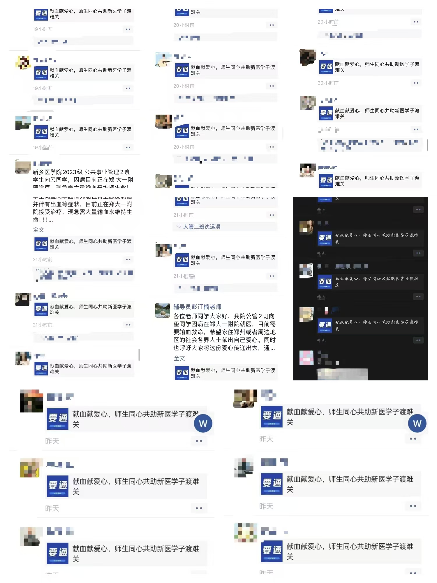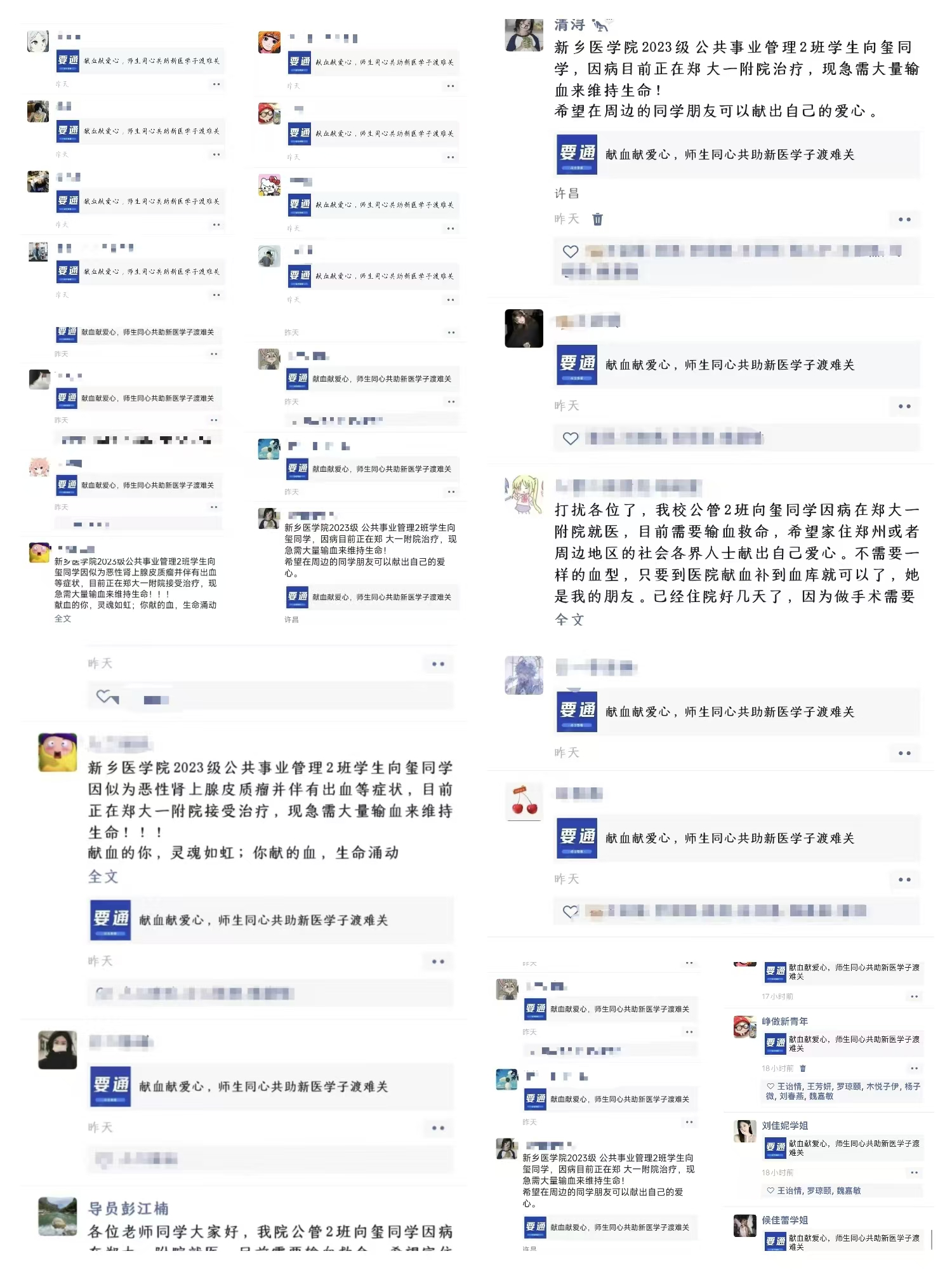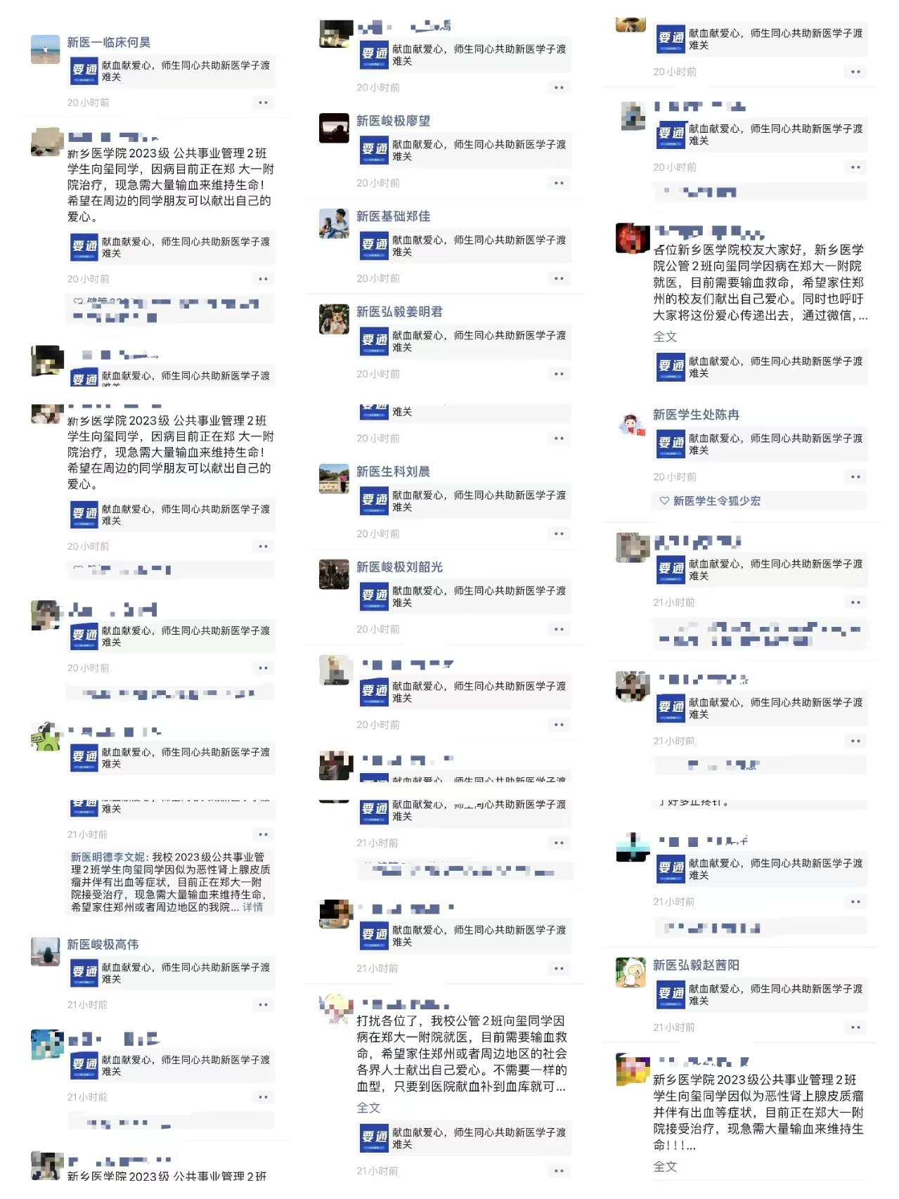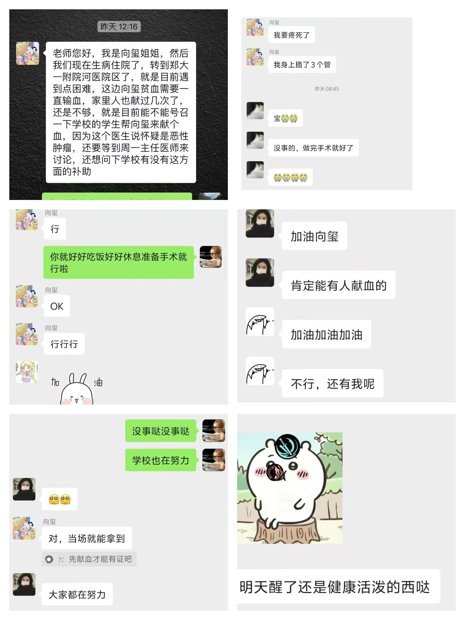 弘毅书院负责人明确提出:“在这个特殊的时刻,我们新医人要团结一心,为向玺同学撑起一片希望的天空”。尽管正值假期,家住郑州和周边地区的师生积极响应到郑大一附院河医院区,希望能为这位同学贡献自己的一份力量。