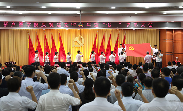 表彰大会现场,伴随着雄壮的国歌乐曲,全体与会人员齐唱国歌,拉开了表彰大会帷幕。在鲜红的党旗前,新党员代表进行了入党宣誓,老党员代表李东亮同志带领老党员重温了入党誓词。随后,老党员代表为新党员代表佩戴党徽。