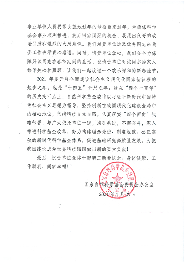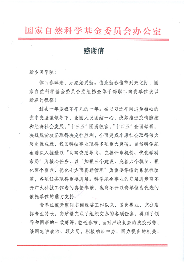 日前,国家自然科学基金委办公室来函对我校倪天军同志提出通报表扬。倪天军同志于2021年1月借调到国家自然科学基金委工作,为期一年。借调以来,他爱岗敬业,充分发挥专业特长,高质量完成了交办的各项任务,得到了国家自然科学基金委领导和同事们的一致好评。临近春节,面对复杂严峻的抗疫形势,倪天军同志积极响应中办、国办就地过年的号召留京过年,展现出新医人良好的政治品质和强烈的大局意识。特此对倪天军进行通报表扬。
