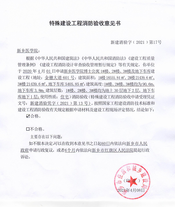 近日,我校博士公寓项目在新乡市住建局质监站消防验收部门监督下,经新乡市消防验收专家组综合评定,消防专项验收合格。学校基建处以及博士公寓设计、施工、监理、消防整改、消防检测单位参加了此次验收。