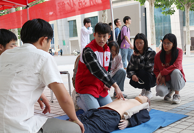 举办急救CPR培训现场演练。组织志愿者在南校区五环广场开展CPR现场演练,给同学讲解并演示心肺复苏流程及注意事项。现场同学认真学习并在模型人上亲手操作急救技能;志愿者手把手辅助同学们进行操作演示。本次活动累计参与操作实践并能掌握CPR的同学达200余人。