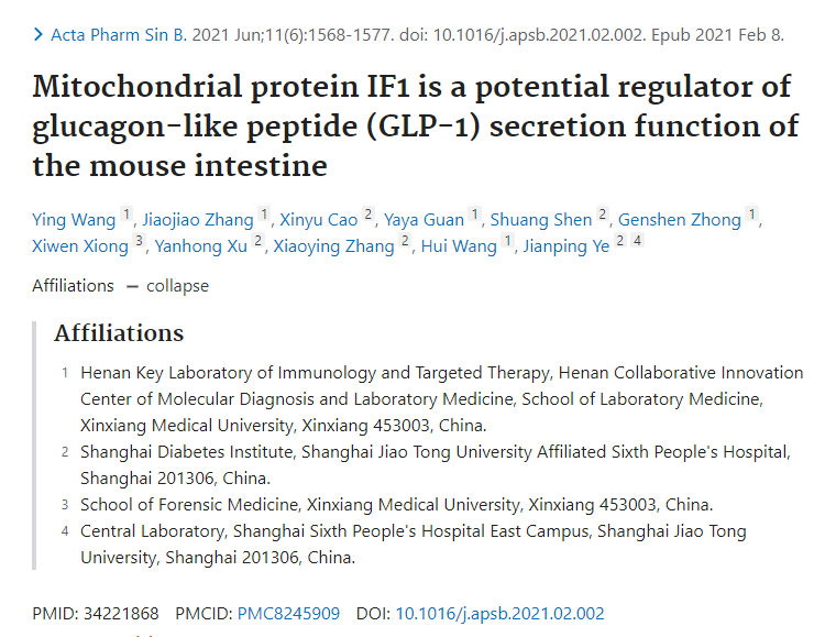 近日,国际著名期刊《Acta Pharmaceutica Sinica B》上发表了我校特聘教授叶建平课题组的最新研究成果“Mitochondrial protein IF1 is a potential regulator of glucagon-like peptide (GLP-1) secretion function of the mouse intestine”。该成果以我校医学检验学院、河南省免疫与靶向药物重点实验室为第一作者单位,医学检验学院硕士研究生王莹为第一作者,王辉教授和叶建平教授为共同通讯作者,受到国家重点研发计划、NSFC-河南省联合基金和科技部“111计划”等项目资助。
