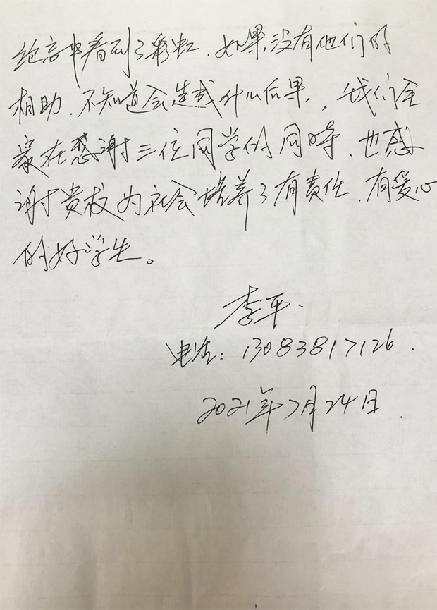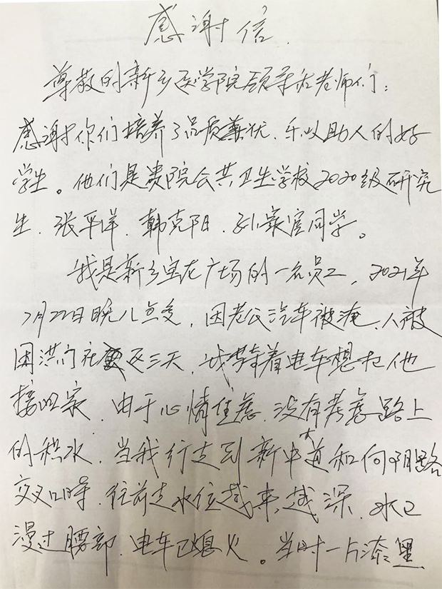 近日,学校收到一封情真意切的感谢信,信中感谢了我校公共卫生学院三名研究生:“感谢你们,让我在绝望中看到了彩虹,我们全家在感谢三位同学的同时,也感谢贵校为社会培养了有责任、有爱心的好学生!”