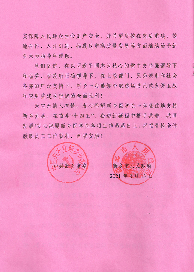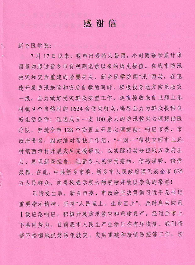近日,新乡市市委、市政府给我校发来感谢信,感谢我校在新乡市防汛救灾工作中作出的重要贡献。