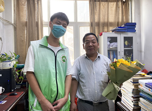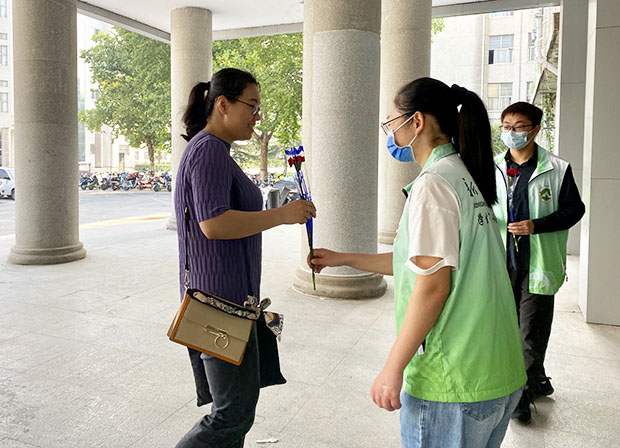 一大早,参与教师节文明献礼活动的同学们手捧鲜花,守候在各个校区,为辛勤工作的老师们献上鲜花及衷心的问候。同学们一声声诚挚的问候“老师您辛苦了!祝您教师节快乐!”带给老师们温馨的祝福。献礼学生代表走进教研室、实验室、办公室为老师们送上一束鲜花、敬上一杯茶,鞠上一个躬,以“三个一”的方式向老师们表达着最真诚的感谢与祝福。
