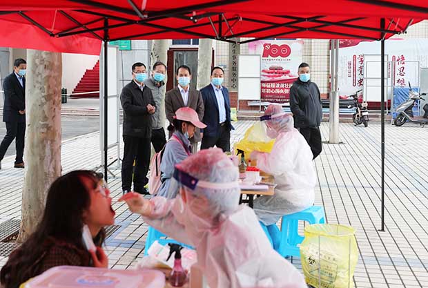 在南校区五环广场各学院报到处,雒保军与现场工作人员进行交流,听取了相关学院负责人关于返校报道人数、校区居住分布等情况的汇报,检查了核酸检测工作开展情况,并对低温环境下坚守岗位的工作人员表示由衷的感谢和亲切的慰问。