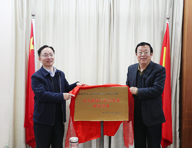 10月14日下午,我校在办公楼三楼会议室举行“河南省人文社会科学重点研究基地---公共健康与社会发展研究基地”揭牌仪式。省社科联党组书记、主席李庚香,省社科联学会处处长宋淑芳,我校党委副书记、基地负责人郝红军出席。基地学术带头人及部分研究人员参加。揭牌仪式由党委宣传部负责人主持。