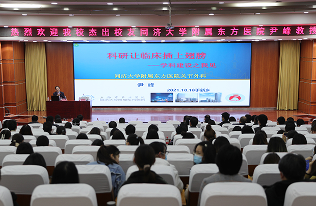 10月18日下午,我校杰出校友、同济大学附属东方医院尹峰教授受邀在第一报告厅作题为《科研让临床插上翅膀——学科建设之我见》的学术报告。各学院及附属医院相关负责人和教师代表参加。报告会由学科建设办公室负责人主持。