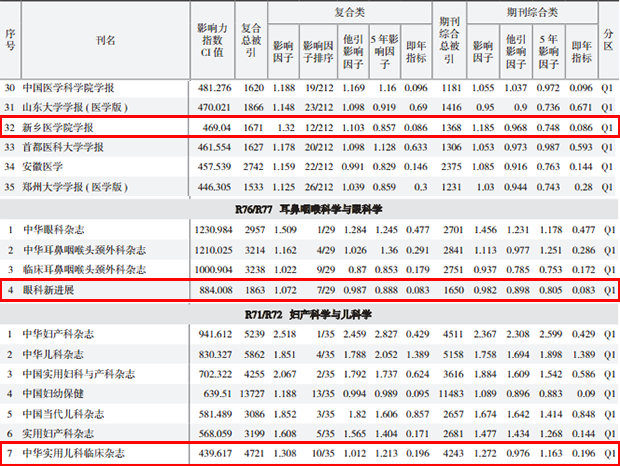 《中国学术期刊影响因子年报》是中国科学文献计量评价研究中心自2002年开始、连续19年对中国学术期刊的国内影响力进行定量统计和分析的年度评价报告。2021版被评价期刊共计6099种,其中自然科学与工程技术期刊3966种,人文社会科学期刊2256种。《华亿在线手机版(大中国区)学报》在212种医药卫生综合杂志中位列第32(首次入选Q1),《眼科新进展》在29种耳鼻咽喉科学与眼科学杂志中位列第4(眼科学期刊第2),《中华实用儿科临床杂志》在35种妇产科学与儿科学杂志中位列第7(儿科学期刊第3)。