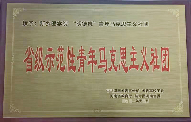近日,由省委宣传部、省委高校工委、省教育厅、团省委联合印发《关于公布2021年度省级示范性青年马克思主义社团和省级优秀青年马克思主义社团评选结果的通知》(豫宣通﹝2021﹞75号),经过资格审核、专家评审,我校“明德班”青年马克思主义社团被评为首批“省级示范性青年马克思主义社团”,焦石文老师荣获社团工作优秀指导老师,基础医学院学生肖子怡荣获社团工作先进个人。