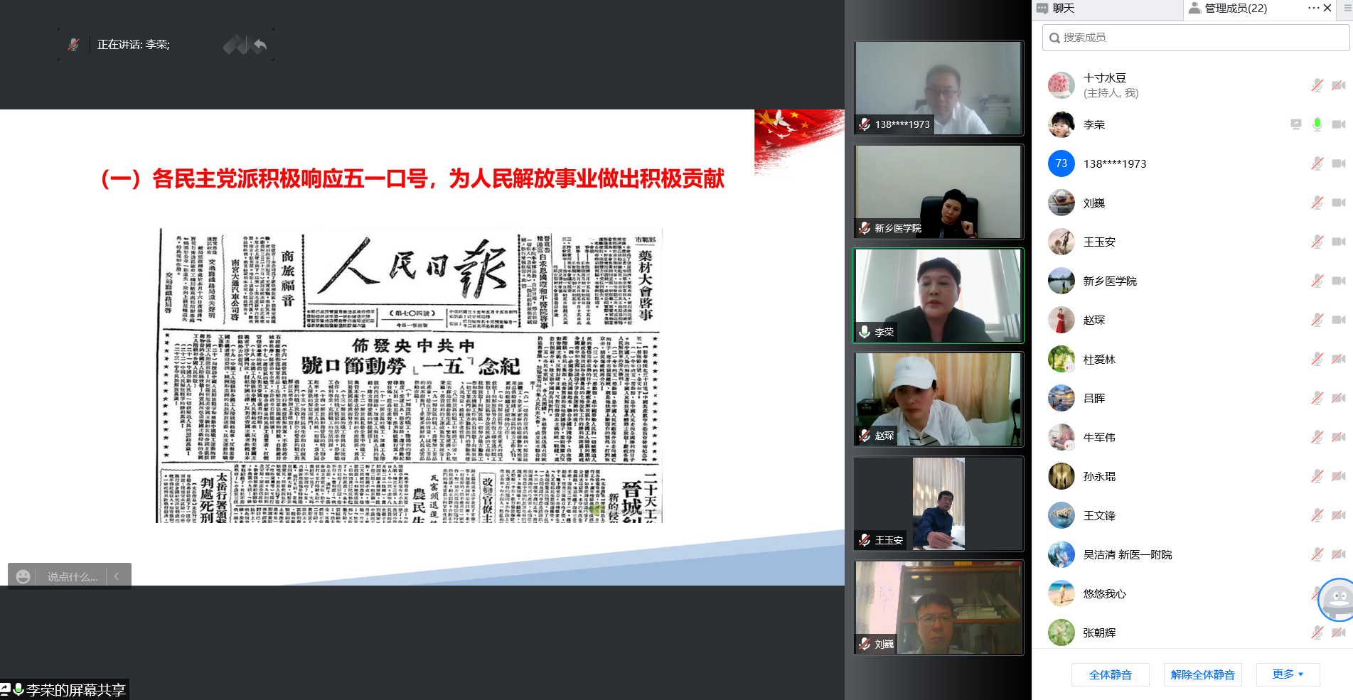 5月5日上午,我校统一战线通过网络在线形式开展“同心大讲堂”暨统一战线联合中心组学习活动,各民主党派和统战团体负责人,以及党委统战部全体成员共20余人参加了学习活动。