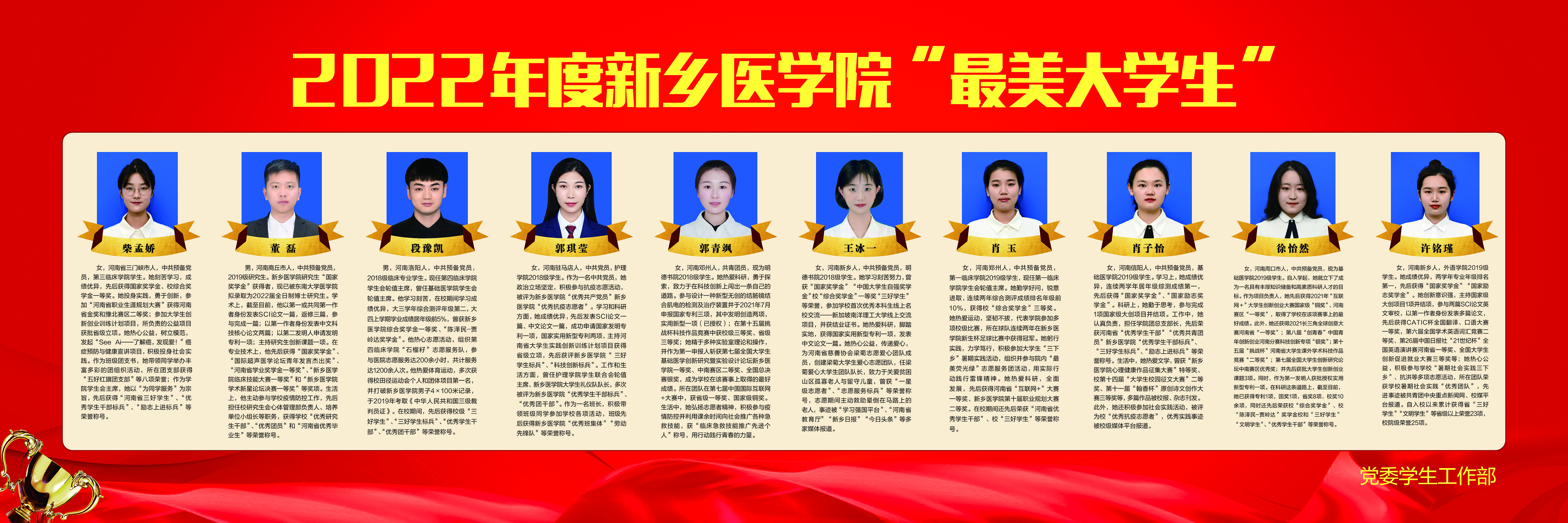 近日,我校组织开展2022年度“最美教师”和“最美大学生”评选活动。活动自启动以来受到了广大师生的广泛关注,经个人申报,基层单位推荐、资格审核、公众投票、专家组综合评议等环节,最终评选基础医学院王小引、药学院刘宇飞、生命科学技术学院关建义、护理学院张金华、医学院检验学院张黎琛、法医学院尚万兵、马克思主义学院罗会宇、第一临床学院岳修勤、医学人文学院段鹏超、第三临床学院娄政驰等10名教师为2022年度“最美教师”;第一临床学院肖玉、基础医学院肖子怡、明德书院王冰一 、基础医学院徐怡然 、研究生处董磊、第三临床学院柴孟娇 、明德书院郭青飒 、外语学院许铭瑾、护理学院郭琪莹、第四临床学院段豫凯等10名大学生为2022年度“最美大学生”。