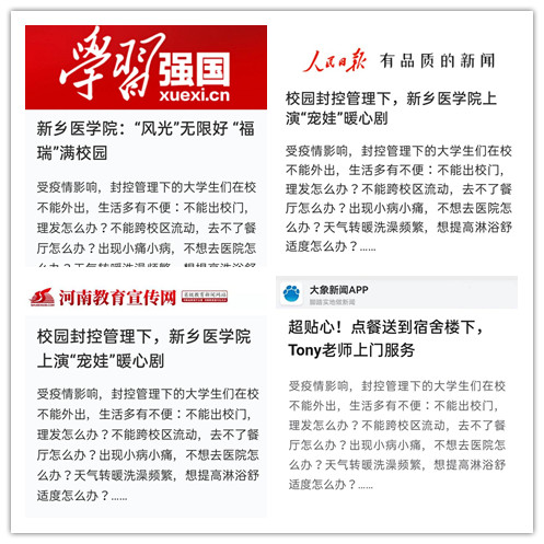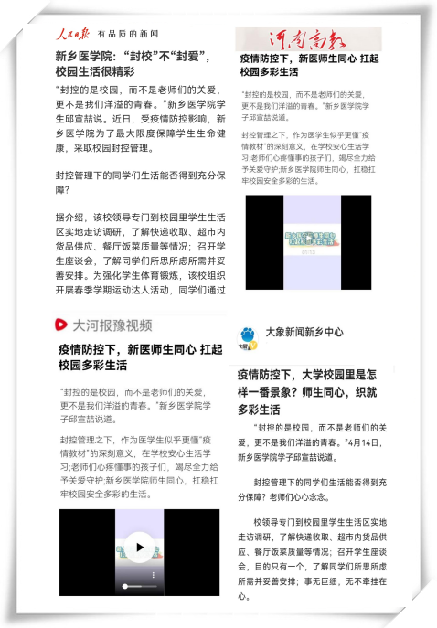 受疫情影响,自三月中旬以来,学校按照相关要求采取封控管理。青春活泼意气风发的大学生们,在校生活学习如何安排如何保障,引父母牵挂、社会关心。我校统筹疫情防控和宣传思想工作,有策划、有安排、有次序地通过人民日报客户端、河南日报客户端、学习强国、河南教育宣传网等多家权威媒体,大平台、多角度推出一系列外宣报道,从用“实心”、出“实招”、办“实事”三个方面向外界摆事实、展形象。(供稿:刘天庆)