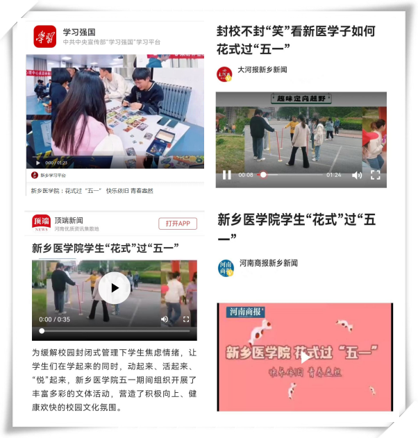 充实的校园生活也是此阶段外宣工作的重点,于是发出了以“师生同心扛起校园多彩生活”“‘花式’过五一 快乐依旧 青春盎然”为题的两篇新闻报道。首先从题目中便可感受到学校“招数”的丰富新颖。其次,在师生同心扛起校园多彩生活的报道中,介绍了学校通过科学有效的举措保障同学们在学的学习、运动、娱乐、心安等;在“花式”过五一的报道中,重点介绍的是假期中学校的“实招”活动,带领同学们规避疫情带来的不利影响,依旧洋溢积极乐观的青春。此外,该两篇报道在文图宣传的基础上,专门制作了视频,将活动组织的充实精彩展现的更为直观,新闻的可读性更强、传播效果更佳。