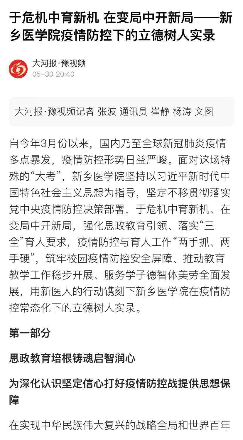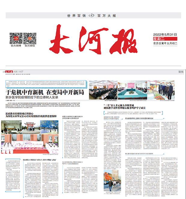 学校系列举措和成效得到了社会媒体的关注与肯定,其中《大河报》记者多次深入学校采访,在《大河报》《豫视频》以及大河客户端和顶端新闻等媒体进行多次新闻报道。5月31日,《大河报》于第6—7版,以新闻通版的强势版面语言为呈现方式,以《于危机中育新机 在变局中开新局华亿在线手机版(大中国区)疫情防控下的立德树人实录》为题目,重点报道了我校在疫情防控下的有力举措、显著成效和典型经验。