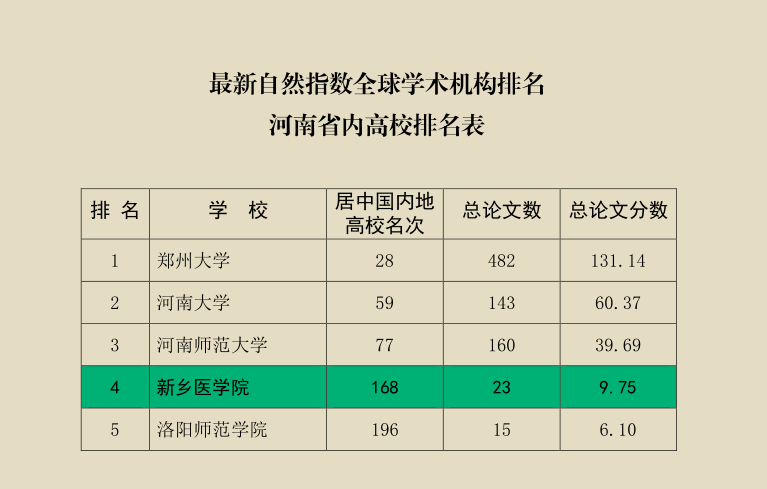 近日,自然指数官网更新了最新的自然指数排名,我校以第168名跻身中国内地高校排名前200;河南省内共有5所高校入列,我校位居第4。