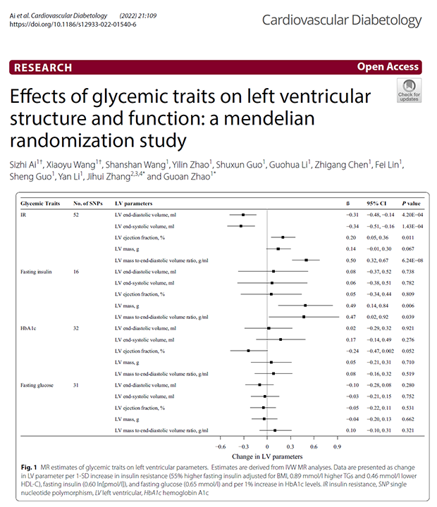 近日,我校赵国安教授研究团队在国际著名期刊Cardiovascular Diabetology(中科院一区,IF = 9.951)在线发表题为“Effects of glycemic traits on left ventricular structure and function: a mendelian randomization study”的研究论文。该研究工作得到了广东省人民医院张继辉研究员的大力支持,张继辉研究员与我校第一附属医院赵国安教授为本论文的共同通讯作者。第一附属医院艾思志博士和硕士研究生王晓昱为本论文的共同第一作者。第一附属医院为第一作者和通讯作者单位。该研究工作获得了国家自然科学基金、科技部项目及河南省医学科技攻关计划项目的资助。该研究深入阐明了血糖特征与左心室结构和功能之间的因果关联,证实了胰岛素抵抗的遗传易感性而非血糖水平与左心室结构和功能的不良改变有关。