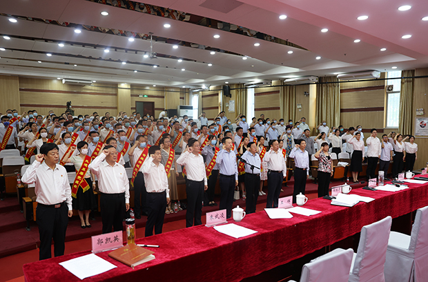 表彰大会在庄严的国歌声中开幕。党员代表为新发展党员代表佩戴了党员徽章;全体人员面向党旗肃立,新党员代表进行入党宣誓,老党员重温入党誓词,任文杰领誓。