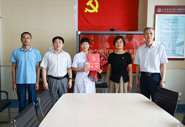 6月30日,新乡市总工会党组成员、副主席李素珍,新乡市教科文卫体工会主席高志行莅临医院为路平颁授奖章。
