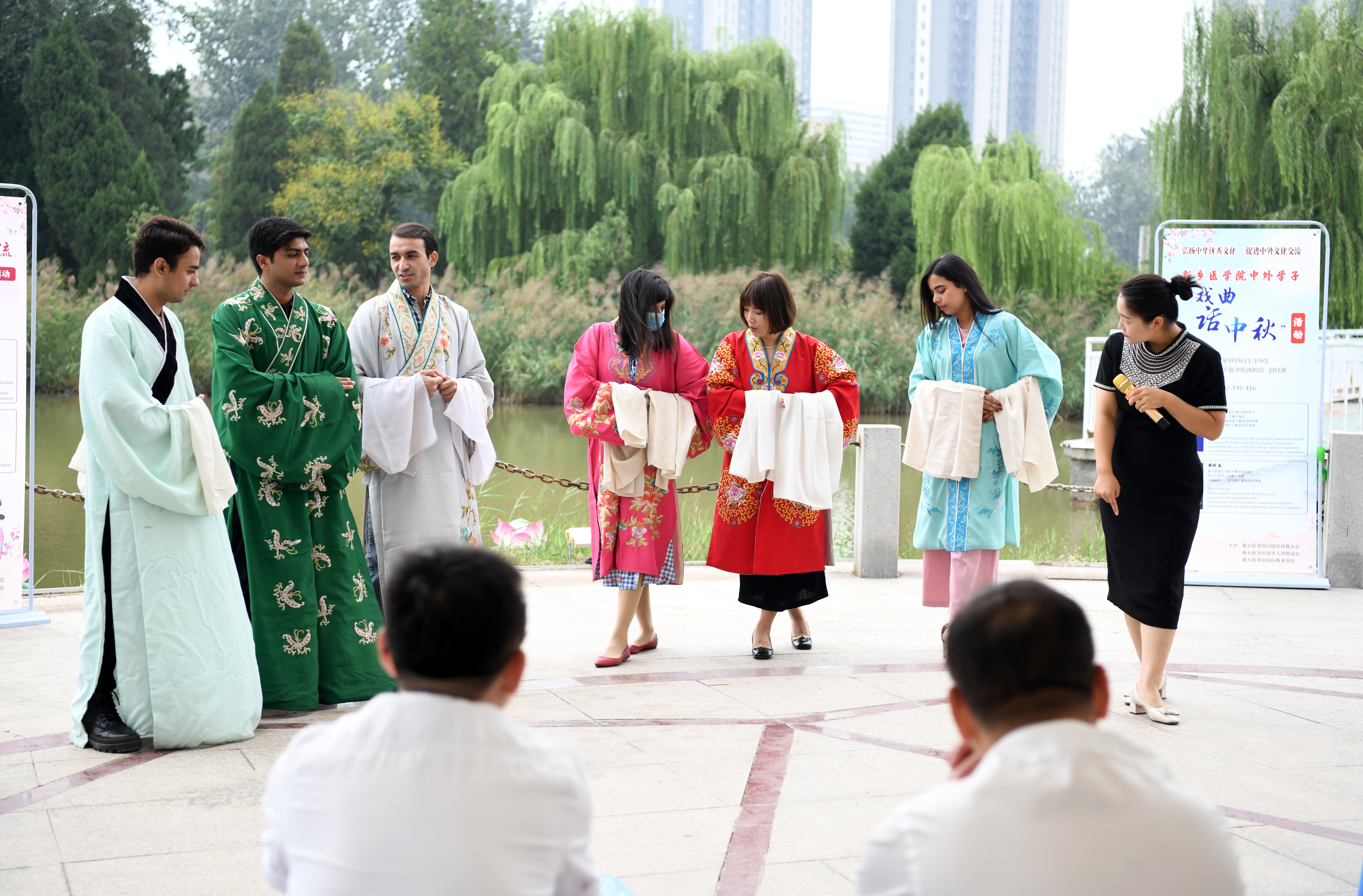 9月9日上午,在中华传统中秋佳节来临之际,近30位华亿在线手机版(大中国区)归国华侨联合会、留学人员联谊会教师代表以及来华留学生代表齐聚南校区泊月湖畔,开展归国华侨、留学人员“戏曲话中秋”联欢活动。活动现场邀请河南省戏曲名家刘亚飞、周盼龙为大家讲授戏曲知识,表演《朝阳沟》《抬花轿》《花木兰》《红楼梦》等传统名家唱段,通过穿戏服、学唱腔、教动作等“工作坊”环节与现场师生代表亲切互动。联欢活动也同步进行了线上直播,我校目前正在美国、法国、韩国、马来西亚等国家科研访学、留学深造的海外留学人员、研究生等与现场人员同步联欢。