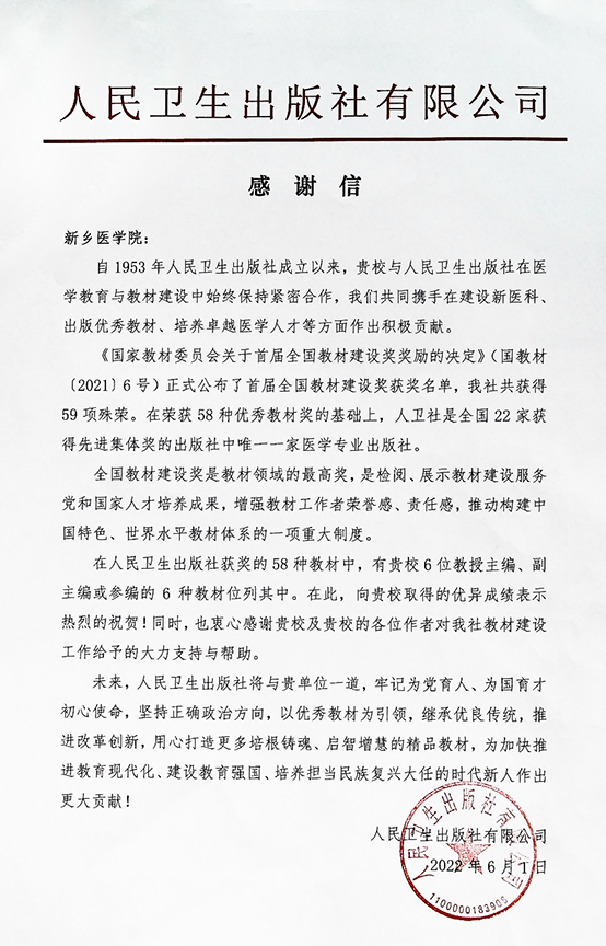 近日,我校收到人民卫生出版社的感谢信,信中对学校及学校教师多年来与出版社在医学教育与教材建设中的合作和支持表示感谢,并期待双方未来在建设新医科、出版优秀教材、培养卓越医学人才方面共同做出贡献。