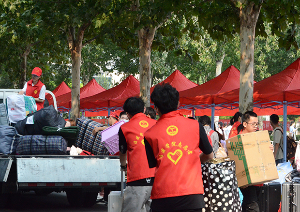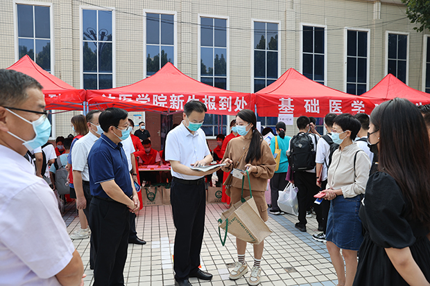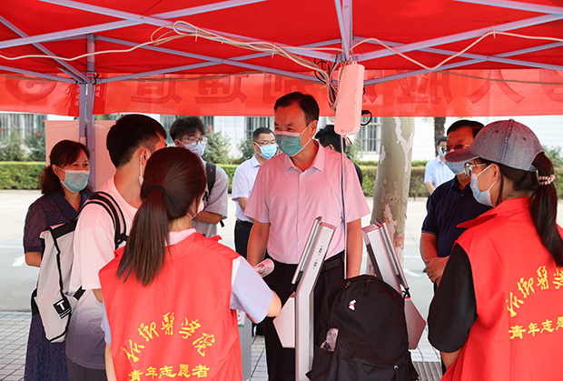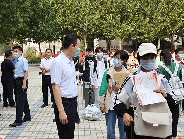 9月13日上午,校领导任文杰、郝红军、王辉、刘国庚、朱武凌、靳新峰、郭凯英、邵金远带领相关职能部门负责人来到迎新现场,看望慰问报到新生和迎新工作人员。