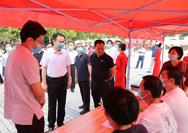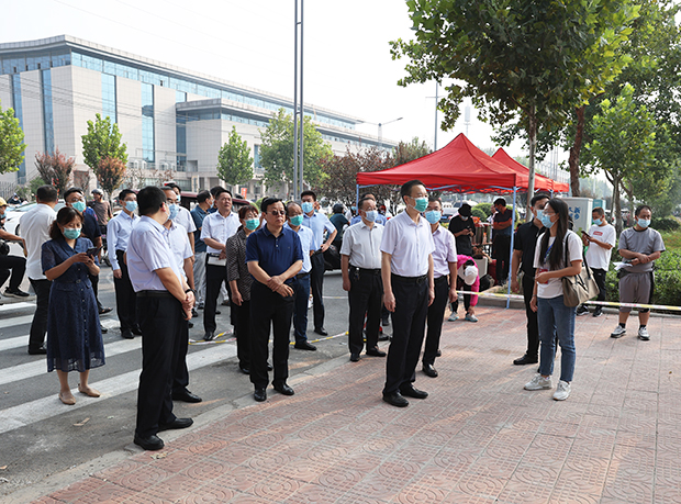 校领导一行经向阳路步行来到南校区新生行李转运处,查看行李消毒、标签粘贴、装车转运等流程,向热心服务的教职工和学生志愿者表示慰问。在博济楼一楼新生核酸检测处,任文杰向医务人员了解工作环境条件、检测时间安排等情况,对他们的辛苦付出表示感谢。