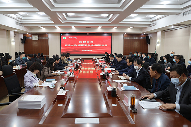 校长任文杰简要介绍了学校的基本情况,并指出,学校党委始终把文明校园创建和精神文明建设工作作为一项长期性、综合性的系统工作来抓,在全校营造了人人关心精神文明建设、人人重视精神文明建设、人人参与精神文明建设的良好氛围,取得了显著建设成效。他从注重思想道德建设,夯实理想信念根基;加强领导班子建设,打造过硬干部队伍;健全师德师风长效机制,建设高素质教师队伍;加强校园文化建设,营造浓厚育人氛围;建设平安和谐校园环境,发挥高校社会责任;加强阵地建设管理,完善各项规章制度等六个方面对我校省级文明校园标兵创建工作进行了详细汇报。任文杰表示,学校将以此次创建为契机,进一步提升精神文明创建水平,进一步提升教育教学管理水平,全面落实立德树人根本任务,加快实现学校内涵式高质量发展。