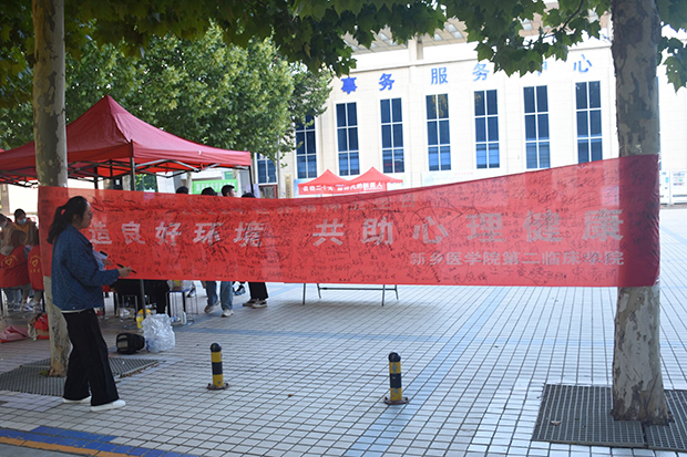 此次活动围绕本年度“营造良好环境,共筑心理健康”的世界精神卫生日主题,精心筹备、周密组织,线上通过学校各级官方媒体渠道广泛宣传,线下制作宣传条幅、摆放活动展板,大屏幕播放宣传视频。同学们关注第二临床学院官方微信公众号并填写精神卫生知识试卷,完成答题后可在宣传横幅处签名。试题内容主要来源于国家卫健委编制的《心理健康素养十条》,旨在提升我校学子对心理健康知识的了解认知。活动现场,同学们情绪高涨,踊跃参与活动,并在横幅上签名留言。心理学院2020级应用心理学专业李微表示:“我作为心理学相关专业的一名新医学子,希望此次活动能使更多人了解精神卫生与心理健康知识,帮助他们走出误区、拥抱生活,成长为更加积极乐观、健康向上的自己。”