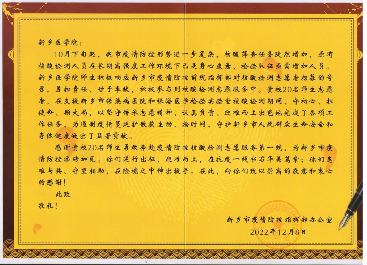 “你们逆行出征、迎难而上,在抗疫一线书写华美篇章;你们患难与甘、守望相助,在险境之中伸出援手。在此,向你们致以崇高的敬意和衷心的感谢!”12月上旬,我校收到来自新乡市疫情防控指挥部的感谢信,感谢我校20名师生志愿者支援新乡市传染病医院和银海医学检验实验室核酸检测工作。