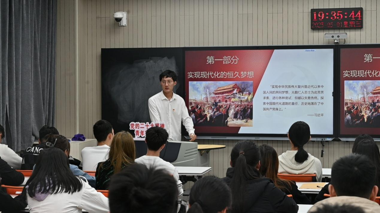 青年大学生宣讲团深入社团、班级、宿舍等开展党的二十大精神宣讲志愿服务活动。宣讲以“进入新时代的现实基础”“新时代十年的伟大成就”和“以中国式现代化推进中华民族伟大复兴”三个部分展开,宣讲员们用学生感兴趣、能理解的青春话语讲述中国共产党带领人民探索现代化道路的伟大历程,用纪录片、现场实录等丰富影像资料,让学习党的二十大精神更加深入学生内心。