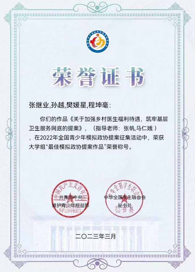近日,由共青团中央、中华全国学生联合会秘书处联合主办的2022年全国模拟政协提案征集活动评审结果揭晓。我校张继业、孙越、樊媛星、程坤毫同学作品《关于加强乡村医生福利待遇,筑牢基层卫生服务网底的提案》(指导老师:张帆、马仁娥),从全国参与评审的众多作品中脱颖而出,荣获大学组“最佳模拟政协提案作品”。