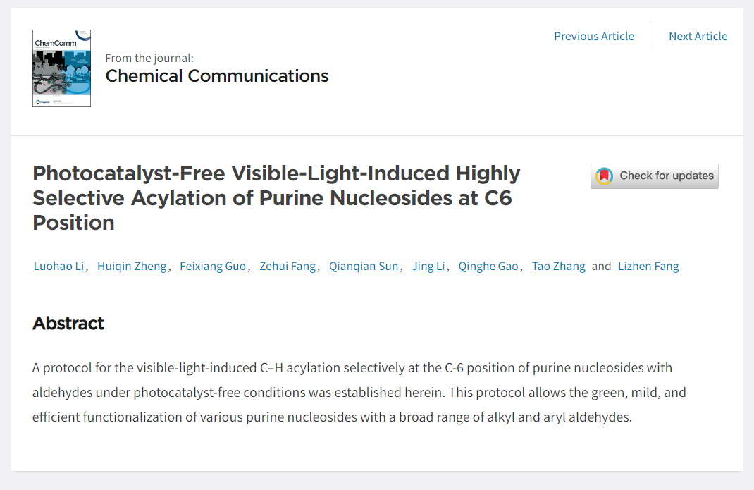 近日,国际知名期刊《Chemical Communications》上发表了我校药学院教授房立真课题组的最新研究成果“Photocatalyst-Free Visible-Light-Induced Highly Selective Acylation of Purine Nucleosides at C6 Position”。该成果以我校药学院为第一作者单位,药学院2020级硕士研究生李洛豪为第一作者,房立真教授为通讯作者。该成果的取得表明我校药学研究生培养质量和科研攻关水平上又有了新的突破。