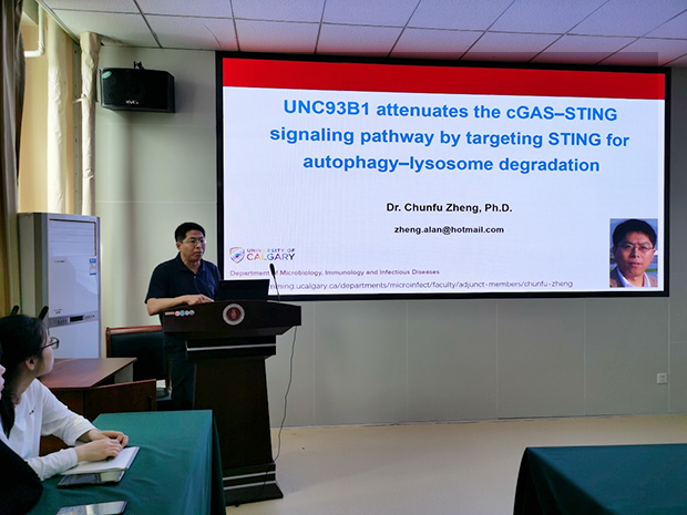 4月11日上午,加拿大卡尔加里大学教授郑春福应我校医学技术学院邀请来校进行学术交流。郑春福以“UNC93B1 attenuates the cGAS-STING signaling pathway by targeting STING for autophagy-lysosome degradation”为题作学术报告,学院相关负责人及部分师生参加。