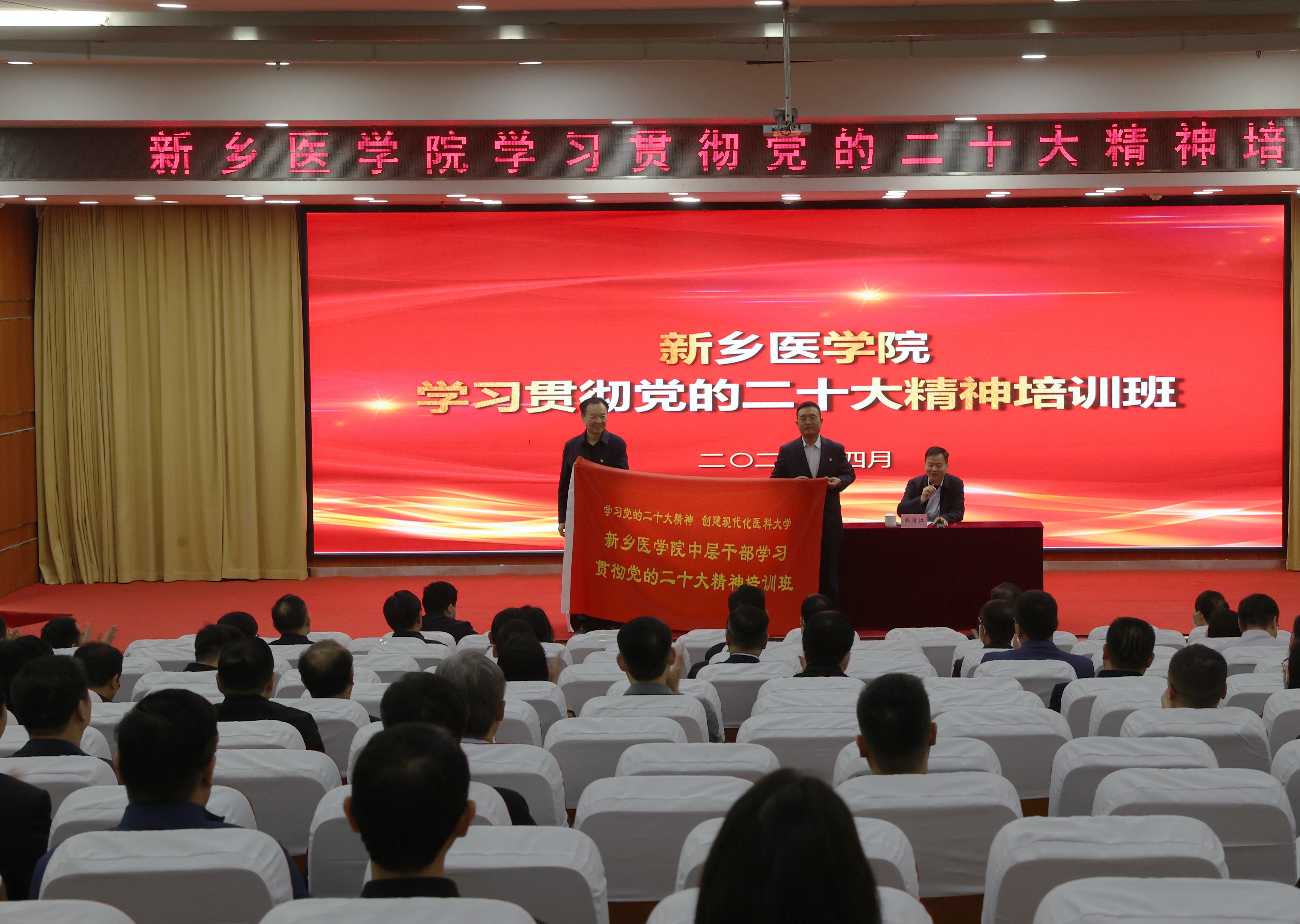 4月12日上午,培训班在博学楼第一报告厅开班。校党委书记、校长任文杰以“汲取经验智慧 做好融合文章 以党建高质量引领现代化医科大学建设高质量”为题作首场专题报告。全体校领导、全体中层干部参加学习,校党委副书记陈清江主持培训会。