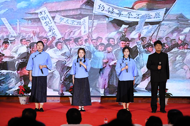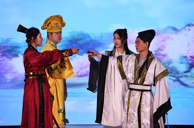 一曲《万疆》带领本场展演走向高潮,明德书院原创诗文朗诵和歌曲的完美结合,勾勒出祖国大好河山的盛世景象;留学生太极拳表演《浩荡乾坤》打出了中国气势,让在场观众感受到中华文化的博大精深、包容并蓄;改编舞台剧《新桃花源记》回顾历史,穿越时空,古代四位伟人齐聚一堂,诉说家国之情,感悟时代变迁,激励新时代青年应投身时代发展浪潮,贡献自己的力量。