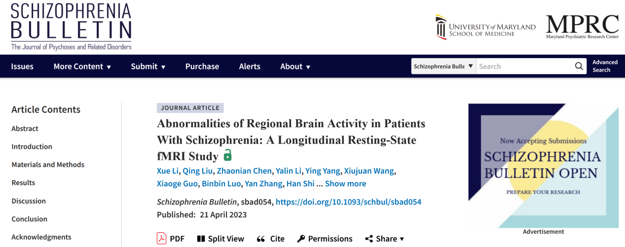 近日,我校吕路线教授团队在国际知名期刊《Schizophrenia Bulletin》上发表题为“Abnormalities of Regional Brain Activity in Patients With Schizophrenia: A Longitudinal Resting-State fMRI Study”的研究论文。该研究以我校第二临床学院硕士研究生李雪和教师刘青为论文共同第一作者,杨勇锋博士为论文通讯作者,我校为第一作者和通讯作者单位。