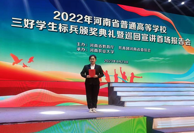 根据河南省教育厅、共青团河南省委《关于评选2022年河南省普通高等学校三好学生、优秀学生干部、先进班集体的通知》精神,经学校推荐、网络评审、专家评议、个人现场展示、专家终审等环节,徐怡然最终荣获该奖项。