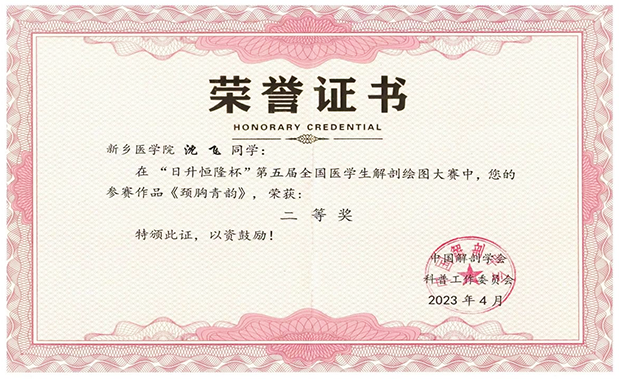 4月22日,中国解剖学会科普工作委员会2023年工作会议暨第五届全国医学生解剖学绘图大赛决赛在辽宁举行。来自全国40余所医学院校的科普工作委员会委员、一线科普专家和学生代表参加会议。我校学生叶梅池的作品《五脏藏神》(指导教师陶晶、陈志国)及沈飞的作品《颈胸青韵》(指导教师李文奇、郭义威)分获全国一等奖、二等奖。