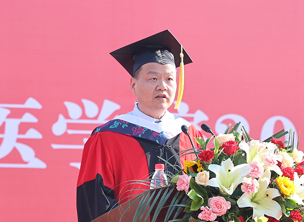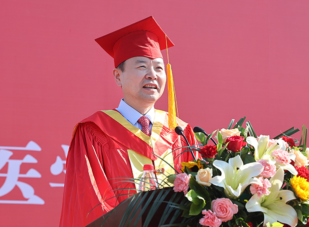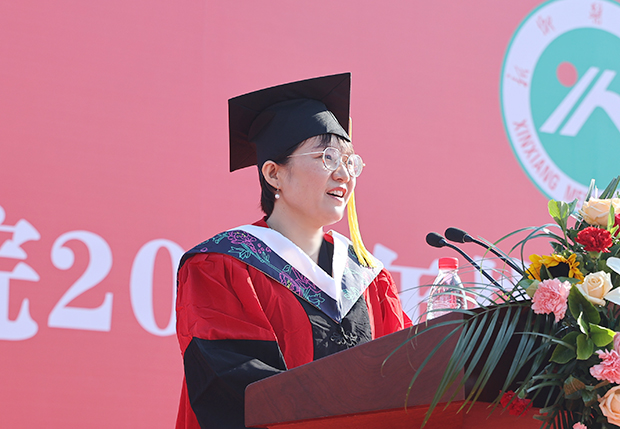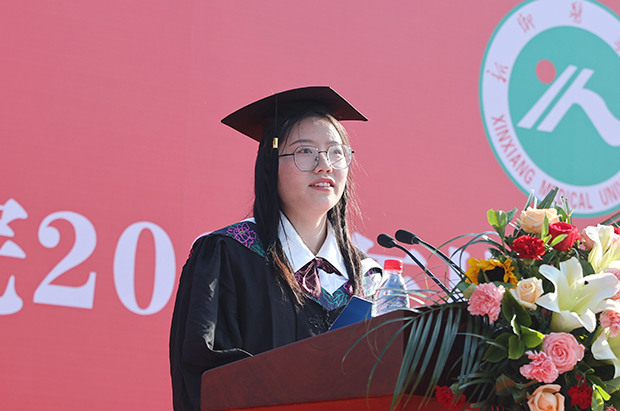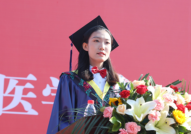 硕士毕业生代表、医学工程学院生物与医药专业黄蓓佳同学,本科毕业生代表、第三临床学院段晓瑞同学分别在毕业典礼上发言。她们回顾了在校生活、学习时的美好时光,表达了对母校的深情、老师的感激、同窗的祝福,并表示会牢记母校“明德博学,至爱致用”的校训,不辜负老师的辛勤培养和期待,不畏艰险、一往无前。教师代表、硕士研究生导师、第一附属医院马东红副教授在发言中希望学成毕业的同学们要坚守正确的人生观和价值观,厚植家国情怀、练就过硬本领,传承新医精神、赓续前辈荣光,践行医者使命、担当时代重任。