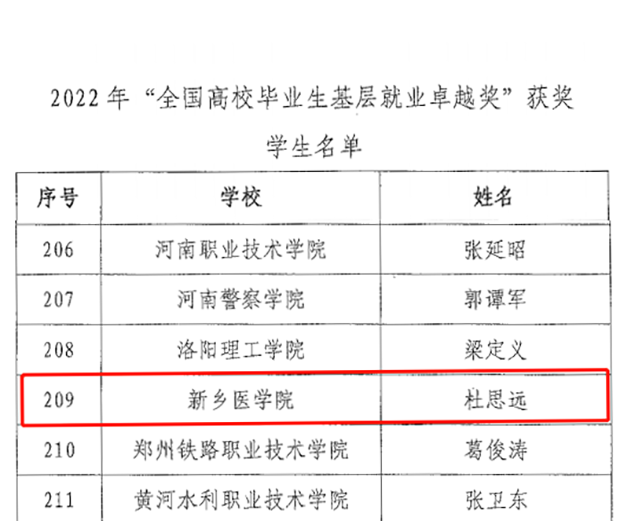 杜思远在2018年住院医师规范化培训结束后到南阳市宛城区乡镇卫生院工作,肩负全科医生使命,扎根基层,通过健康扶贫、家医签约、急诊急救、健康科普宣传、疫情防控救治及医防融合等工作,显著提升辖区医疗卫生水平,先后被授予河南省十佳订单定向全科医生、河南省优秀全科医生、河南省健康科普专家库成员、南阳市卫生健康科技教育工作先进个人等荣誉称号。李杰20年来一直从事职业生涯发展教育与就业创业指导工作,教育引导毕业生把实现个人理想与服务党和国家事业发展需要紧密结合,将个人小我融入祖国的大我中,坚守“就业育人”底色,做学生职业发展的领路人。我校毕业生中涌现了一大批优秀基层医务工作者,为医疗体制改革做出了突出贡献,得到社会广泛认可。