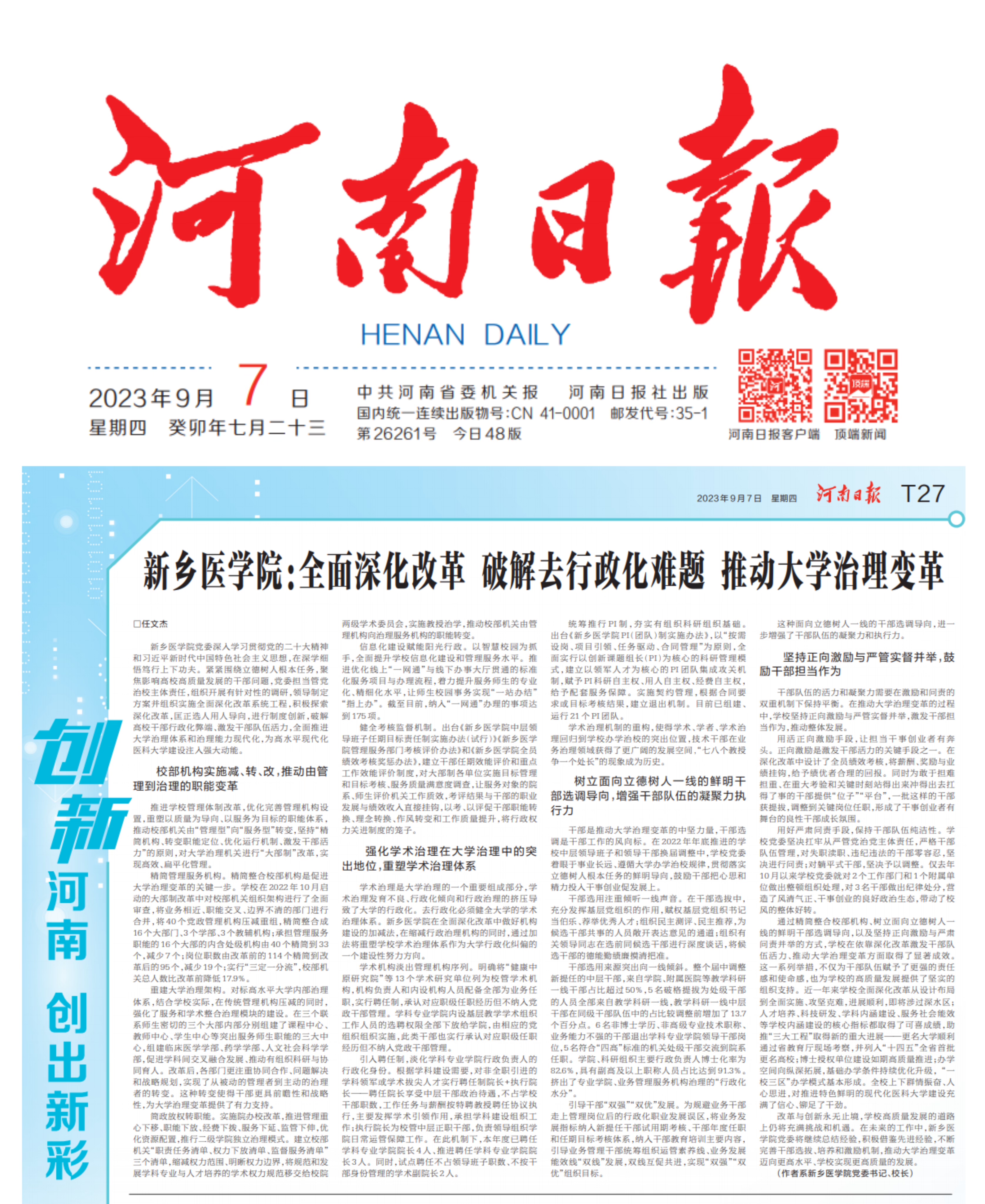 9月7日,《河南日报》第T27版刊发我校党委书记、校长任文杰署名文章《华亿在线手机版(大中国区):全面深化改革 破解去行政化难题 推动大学治理变革》。河南日报客户端进行转载。