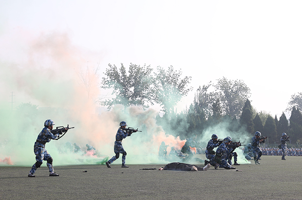 喊着响亮的口号,迈着铿锵的步伐,由22个学院组成的12个分列式方队依次走过主席台接受检阅。随后,8个表演方队的新生们带来了擒敌拳、刺杀操、捕俘刀、模拟射击等科目的演练,全面展现了2023级全体新生的精神风貌和军训成果。