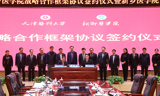 天津医科大学校长郝继辉在致辞中表示,签署战略合作框架协议是双方开展密切合作、共谋高质量发展的一小步,也是推动区域教育医疗资源共建共享、具有标志性意义的一大步。双方将以此为契机,坚持高起点谋划,锚定国家重大战略,加强对合作的整体部署和系统推进,凝聚资源合力,进一步筑牢合作基础;坚持高标准设计,创新人才培养方案,推动教育教学改革,加强科研深度合作,打造学科交叉融合的高地和样板,以点带面推进相关领域深度合作;坚持高效率落实,建立健全合作交流和定期会商机制,在共建大平台、共担大项目、畅通成果转化渠道等方面持续发力,打造更多有影响力的重大标志性成果,为津豫两地医学教育与卫生健康事业作出新的贡献。