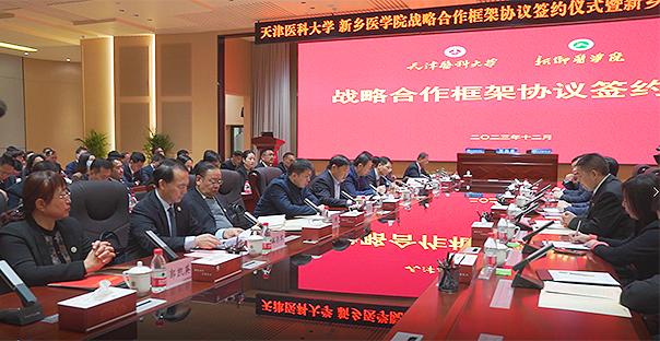 12月11日下午,我校在图书信息楼南二楼报告厅与天津医科大学签署战略合作框架协议并举办高质量发展论坛。天津医科大学党委副书记、校长郝继辉,校党委常委、副校长余鹰;河南省教育厅二级巡视员徐恒振,高教处四级调研员刘克桥;我校全体在校校领导出席签约仪式。天津医科大学相关职能部门负责人,我校各职能部门、学部、教辅机构主要负责人,书院、学院、附属医院党政主要负责人参加。仪式由校党委委员、副校长雒保军主持。