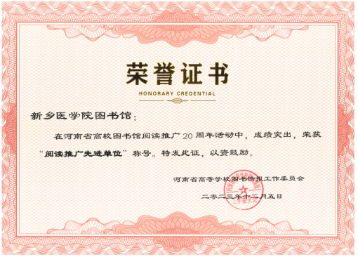 12月15日,由河南省高校图书情报工作委员会主办的河南省高校图书馆阅读推广20周年总结表彰大会在郑州举行。我校图书馆荣获“阅读推广先进单位”称号,大学生图书管理委员会荣获“优秀读书社团”称号,“‘行墨馆藏,书续芳华’——‘医海拾贝’(智力搜书)活动”荣获“优秀阅读推广案例”,李姝娟、邢秋霞两位老师荣获“优秀阅读推广人”称号。