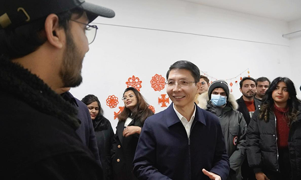 会后,朱武凌来到弘毅书院功能区,与青年学生和来自巴基斯坦、印度等国家的留学生欢聚一堂,共赴一场传统文化之旅。