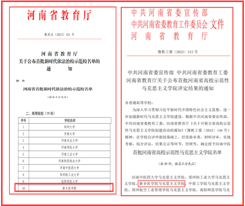 2023年我校高质量落实立德树人根本任务,坚持“健康第一”教育理念,促进学生健康成长、全面发展,学校被评为首批全国健康学校建设单位。同时学校顺利通过省教育厅高校体育工作现场评价,被评定为本科高校学校体育工作一类院校;获批成为首批河南省高校示范性马克思主义学院建设单位;获批为河南省首批新时代依法治校示范校。