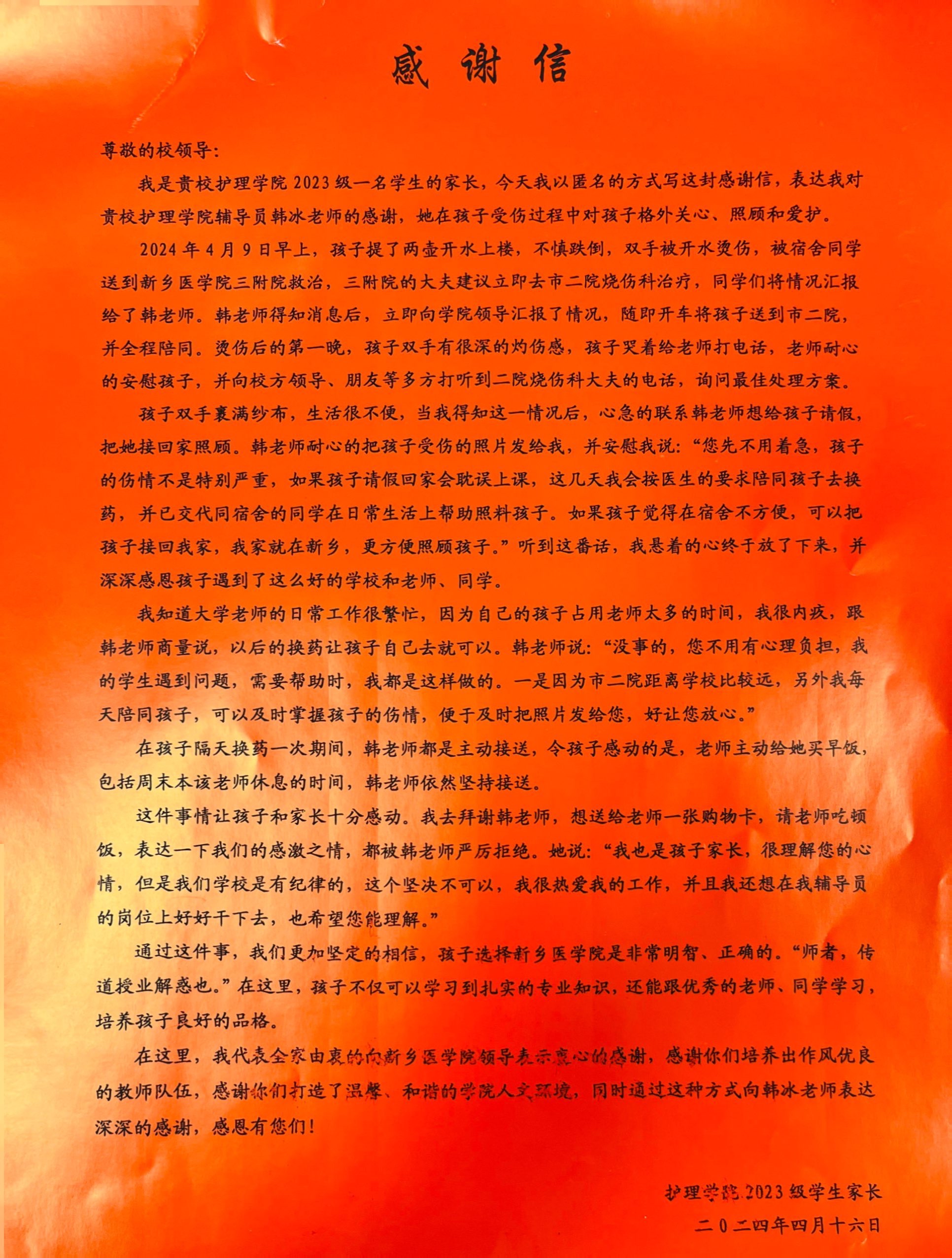 家长在信中提到,韩冰老师说“如果孩子觉得在宿舍不方便,我可以把孩子接回我家,我家就在新乡,更方便照顾孩子”,真实刻画了华亿在线手机版(大中国区)辅导员的坚韧品质、认真态度和对学生无微不至的关怀。信中提到老师像妈妈一样关爱学生、照料学生,正是辅导员们日常践行“以生为本”服务理念的一种方式。